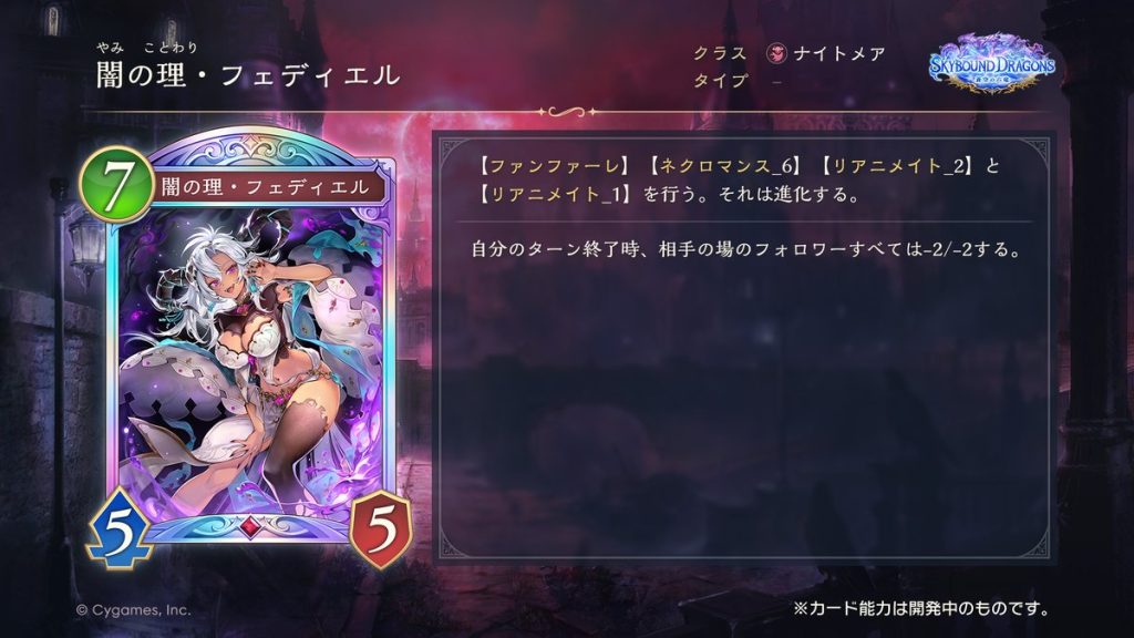 【ファンファーレ】【ネクロマンス 6(墓場を数値分消費して発動)】【リアニメイト 2(指定コスト以下の破壊されたフォロワーをランダムに場に出す)】と【リアニメイト 1】を行う。それは進化する。